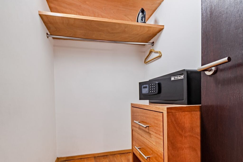 Habitación privada con Cama Queen Size, internet wi-fi, aire acondicionado, tv por cable, caja fuerte, servicio de lavandería ($), amenidades de baño, ducha, agua y café de cortesía la primera noche de hospedaje. Compartiendo con otra habitación cocineta, microondas y frigo bar. Y plancha- tabla de planchar y secador de cabello a solicitud.